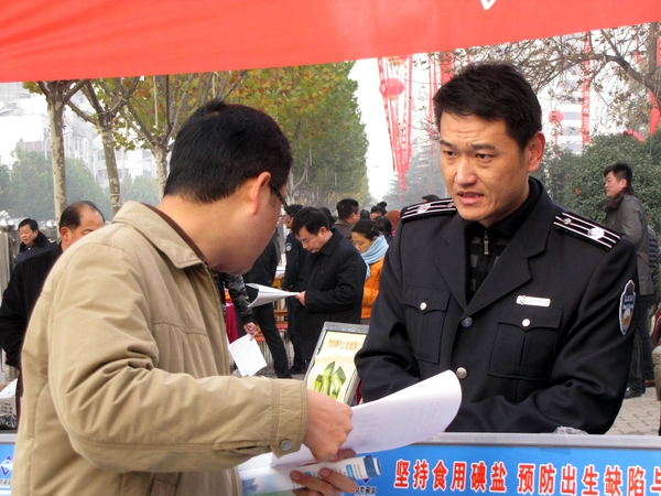 阜陽(yáng)市鹽務(wù)局高度重視此次宣傳活動(dòng),結(jié)合自身業(yè)務(wù)范疇,精心準(zhǔn)備大量法制宣傳資料。早晨7時(shí),天氣陰冷,寒風(fēng)勁吹,我局鹽政執(zhí)法人員在副局長(zhǎng)王道亞的帶領(lǐng)下,早早地布置好法制宣傳臺(tái)。在活動(dòng)現(xiàn)場(chǎng)王道亞親自向過(guò)往群眾宣傳鹽政法律法規(guī)知識(shí),宣傳消費(fèi)者、經(jīng)營(yíng)者的權(quán)利和義務(wù),宣傳消費(fèi)者如何依法維權(quán);進(jìn)行了假冒偽劣食鹽展示和鑒別;開(kāi)展了涉鹽咨詢、受理投訴舉報(bào)。此次宣傳共發(fā)放宣傳資料500余份,接受群眾咨詢200余人次?;顒?dòng)現(xiàn)場(chǎng)布置了咨詢展臺(tái),擺放宣傳圖板10塊、宣傳展架3個(gè)、懸掛 2條生動(dòng)主題橫幅,展示了近期查獲的部分劣質(zhì)私鹽樣品,教市民辨別真假碘鹽的活動(dòng),咨詢臺(tái)前觀看宣傳圖版和前來(lái)咨詢的群眾絡(luò)繹不絕,受到了親自趕赴現(xiàn)場(chǎng)慰問(wèn)的市人大常委副主任李新才、市政府副市長(zhǎng)黃珍、市政協(xié)副主席張永俠、市委宣傳部、市司法局和市依法治市領(lǐng)導(dǎo)小組辦公室有關(guān)領(lǐng)導(dǎo)以及廣大群眾的一致好評(píng)。