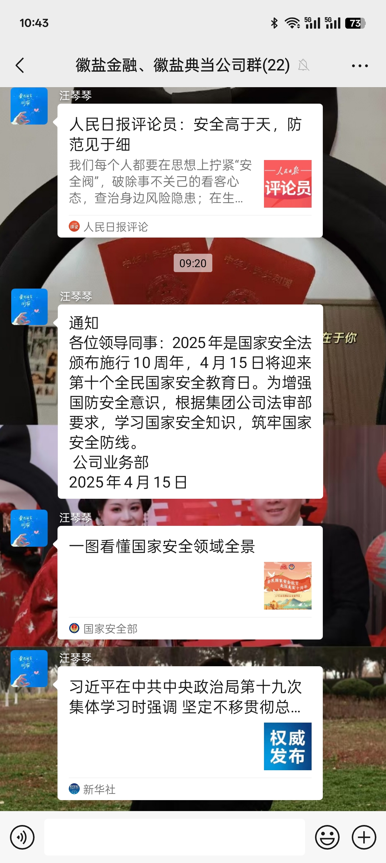 地產(chǎn)集團微信群每日推送國家安全知識圖解、微視頻,以“碎片化學習”提升普法滲透力;集團公司、環(huán)境科技集團微信公眾號發(fā)布專題推文《國家安全,你我同行》,通過案例剖析、法條鏈接等形式,生動解讀《國家安全法》《反間諜法》;徽鹽金融等子公司組織線上答題活動,覆蓋全員,以考促學鞏固國家安全基礎(chǔ)知識,參與率達100%。