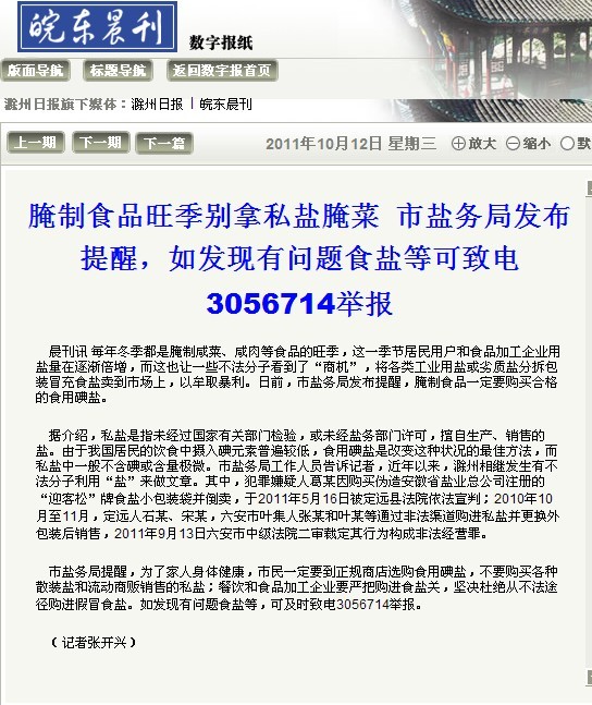 市鹽務(wù)局提醒,為了家人身體健康,市民一定要到正規(guī)商店選購食用碘鹽,不要購買各種散裝鹽和流動商販銷售的私鹽;餐飲和食品加工企業(yè)要嚴把購進食鹽關(guān),堅決杜絕從不法途徑購進假冒食鹽。如發(fā)現(xiàn)有問題食鹽等,可及時致電3056714舉報。
