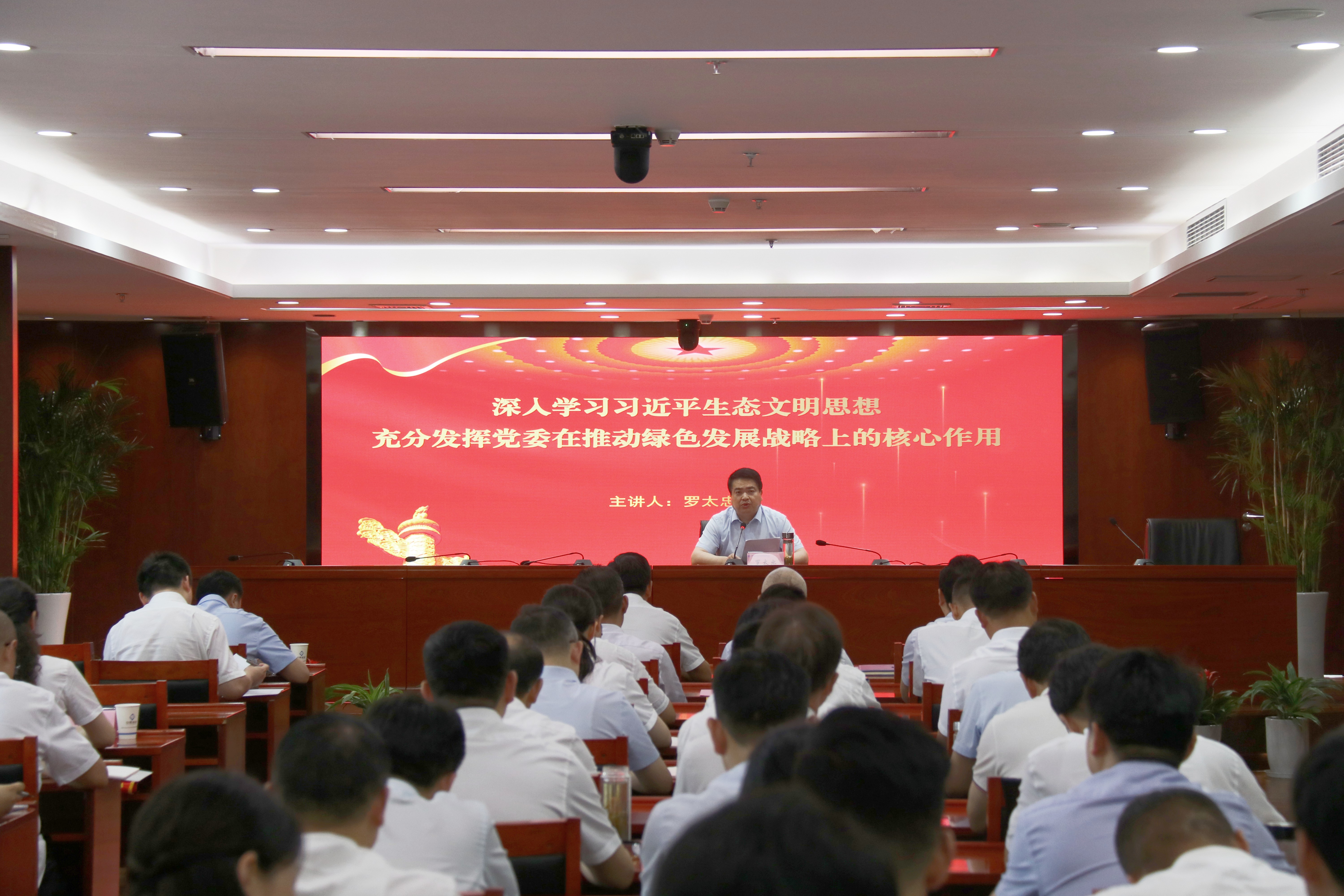 羅太忠以“深入學(xué)習(xí)習(xí)近平生態(tài)文明思想,充分發(fā)揮黨委在推動綠色發(fā)展戰(zhàn)略上的核心作用”為題作專題黨課報告,從深刻理解和把握習(xí)近平新時代中國特色社會主義思想所蘊含的觀點立場方法、深刻理解和把握黨的二十大的戰(zhàn)略部署和目標任務(wù)、深刻理解和把握習(xí)近平總書記關(guān)于本地區(qū)本部門本領(lǐng)域的重要講話、重要指示批示精神以及集團公司未來發(fā)展的戰(zhàn)略和路徑等方面,詳細闡述了習(xí)近平新時代中國特色社會主義思想理論的精髓,明確了集團公司轉(zhuǎn)型生態(tài)環(huán)境產(chǎn)業(yè)的具體路徑,進一步統(tǒng)一了思想、凝聚了共識。羅太忠在報告中指出,黨的二十大將“生態(tài)環(huán)境保護發(fā)生歷史性、轉(zhuǎn)折性、全局性變化”作為新時代十年偉大變革之一,將“促進人與自然和諧共生”作為中國式現(xiàn)代化本質(zhì)要求的重要內(nèi)容。要深刻領(lǐng)會習(xí)近平生態(tài)文明思想和習(xí)近平總書記關(guān)于綠色發(fā)展的重要論述,充分把握貫徹落實綠色發(fā)展戰(zhàn)略的重大意義,進一步增強推動集團公司轉(zhuǎn)型生態(tài)環(huán)境產(chǎn)業(yè)的使命感、責(zé)任感和緊迫感。要學(xué)深悟透習(xí)近平新時代中國特色社會主義思想,更好運用貫穿其中的立場、觀點、方法指導(dǎo)推動工作,進一步提升政治能力、思維能力、實踐能力,把習(xí)近平總書記關(guān)于推進生態(tài)文明、建設(shè)美麗中國的指示精神落到實處。