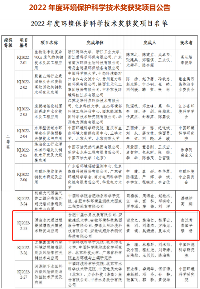 近日,中國環(huán)境科學學會對外發(fā)布了2022年度環(huán)境保護科學技術獎獲獎名單,由安徽環(huán)境科技集團與合肥中盛水務、安徽建筑大學等單位共同研發(fā)攻關的技術成果“污廢水處理過程提質增效關鍵技術研發(fā)與應用”榮獲二等獎。