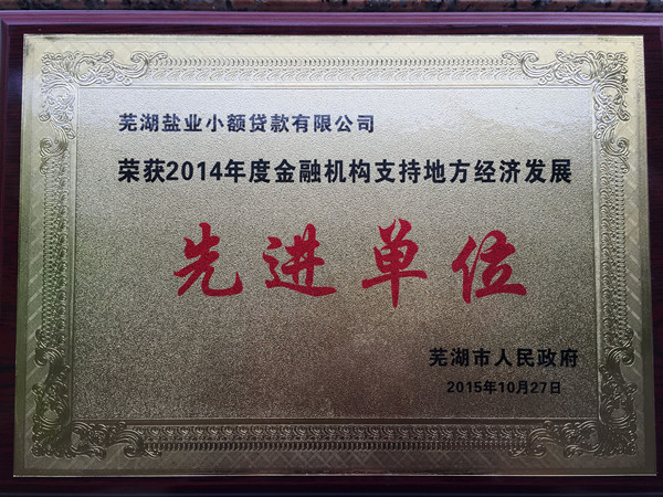 蕪湖市2014年金融機(jī)構(gòu)考核中,蕪湖鹽業(yè)小額貸款有限公司榮獲蕪湖市“金融機(jī)構(gòu)支持地方經(jīng)濟(jì)發(fā)展先進(jìn)單位”稱號。