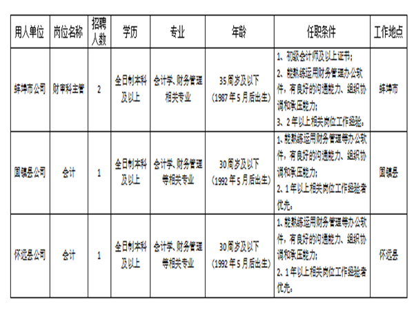 1、市公司財審主管:男女不限,全日制本科及以上學(xué)歷,年齡35周歲及以下,會計學(xué)、財務(wù)管理相關(guān)專業(yè);初級會計師及以上證書,熟練運用財務(wù)管理辦公軟件,有良好的溝通能力、組織協(xié)調(diào)和承壓能力;2年以上相關(guān)崗位工作經(jīng)驗。