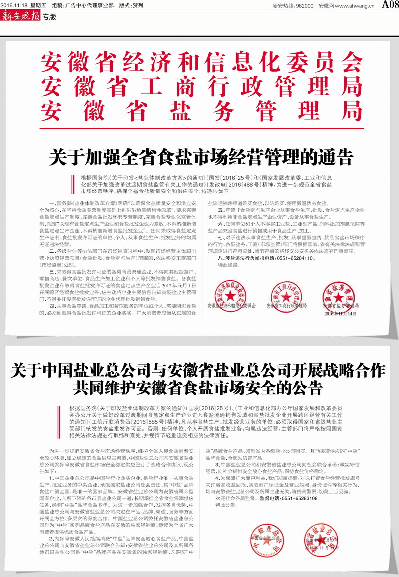 2、完善食鹽專業(yè)化監(jiān)管體制。保持現(xiàn)有專業(yè)化食鹽監(jiān)管體制不變,由鹽業(yè)主管機構(gòu)依法負責食鹽管理與監(jiān)督。各級鹽業(yè)主管機構(gòu)與公安、司法、衛(wèi)生計生、工商、質(zhì)檢、食品藥品監(jiān)管等部門各司其職、密切協(xié)作,依法加強食鹽安全監(jiān)管。
