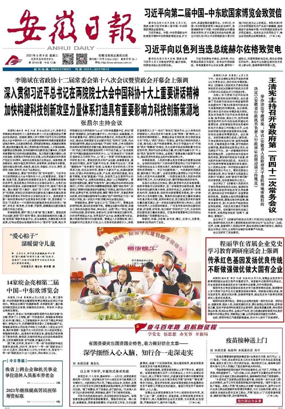 國有企業(yè)發(fā)展史就是一部對黨忠誠、艱苦創(chuàng)業(yè)、銳意改革、服務人民、加強黨建的歷史,要弘揚國企優(yōu)良傳統(tǒng),汲取奮進力量,堅定不移堅持和加強黨的全面領(lǐng)導、推動高質(zhì)量發(fā)展、深化國資國企改革、擔當社會責任、全面從嚴治黨,努力在建設(shè)新階段現(xiàn)代化美好安徽中盡好國企責任、貢獻國企力量,以優(yōu)異成績慶祝建黨100周年。
