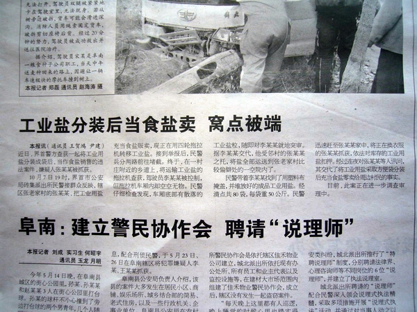 10月7日19時(shí),界首市公安局磚集派出所民警接群眾反映,轄區(qū)張老家村的張某某,把工業(yè)用鹽充當(dāng)食鹽販賣,現(xiàn)正在用四輪拖拉機(jī)轉(zhuǎn)移工業(yè)鹽。接到舉報(bào)后,民警兵分兩路前往堵截。終于,在一村莊附近的鄉(xiāng)道上,將運(yùn)輸工業(yè)鹽的拖拉機(jī)查獲,駕駛員李某某被控制,但拖拉機(jī)車廂內(nèi)卻空空無(wú)物。民警仔細(xì)檢查發(fā)現(xiàn),車廂底部有散落的工業(yè)鹽粒,隨即對(duì)李某某就地突審。據(jù)李某某交代,他受鄰村的張某某之托,將鹽全部運(yùn)送到張老家村比較偏僻處的一空院內(nèi)了。