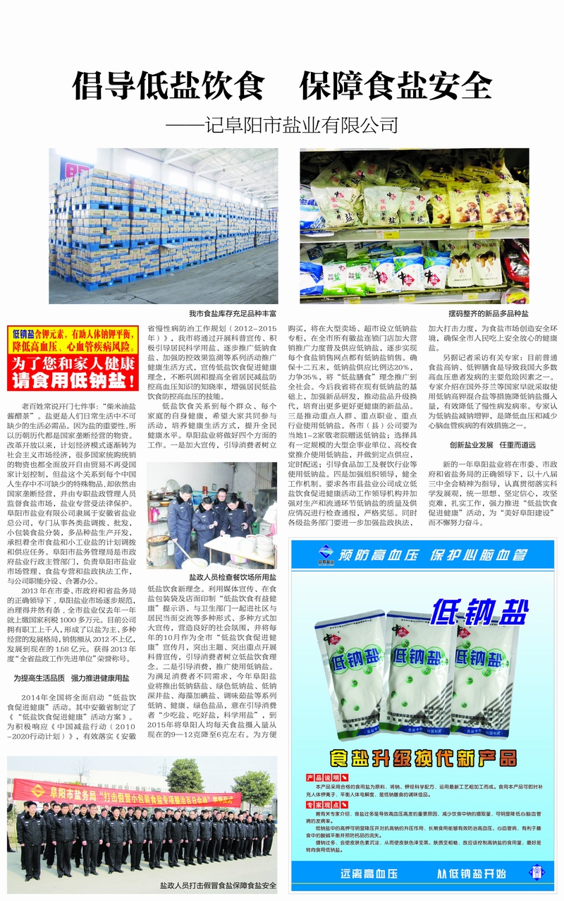 低鹽飲食關(guān)系到每個群眾、每個家庭的自身健康,希望大家共同參與活動,培養(yǎng)健康生活方式,提升全民健康水平。阜陽鹽業(yè)將做好四個方面的工作。一是加大宣傳,引導(dǎo)消費者樹立低鹽飲食新理念。利用媒體宣傳、在食鹽包裝袋及店面印制“低鹽飲食有益健康”提示語、與衛(wèi)生部門一起進社區(qū)與居民當(dāng)面交流等多種形式、多種方式加大宣傳,營造良好的社會氛圍,并將每年的10月作為全市“低鹽飲食促進健康”宣傳月,突出主題、突出重點開展科普宣傳,引導(dǎo)消費者樹立低鹽飲食理念。二是引導(dǎo)消費,推廣使用低鈉鹽。為滿足消費者不同需求,今年阜陽鹽業(yè)將推出低鈉菇鹽、綠色低鈉鹽、低鈉深井鹽、海藻加碘鹽、調(diào)味菇鹽等系列低鈉、健康、綠色鹽品,意在引導(dǎo)消費者“少吃鹽、吃好鹽,科學(xué)用鹽”,到2015年將阜陽人均每天食鹽攝入量從現(xiàn)在的9—12克降至6克左右。為方便購買,將在大型賣場、超市設(shè)立低鈉鹽專柜,在全市所有徽鹽連鎖門店加大營銷推廣力度普及供應(yīng)低鈉鹽,逐步實現(xiàn)每個食鹽銷售網(wǎng)點都有低鈉鹽銷售。確保十二五末,低鈉鹽供應(yīng)比例達20%,力爭35%,將“低鹽膳食”理念推廣到全社會。今后我市將在現(xiàn)有低鈉鹽的基礎(chǔ)上,加強新品研發(fā),推動鹽品升級換代,培育出更多更好更健康的新鹽品。三是推動重點人群、重點職業(yè)、重點行業(yè)使用低鈉鹽。各市(縣)公司要為當(dāng)?shù)?-2家敬老院贈送低鈉鹽;選擇具有一定規(guī)模的大型企事業(yè)單位、高校食堂推介使用低鈉鹽,并做到定點供應(yīng),定時配送;引導(dǎo)食品加工及餐飲行業(yè)等使用低鈉鹽。四是加強組織領(lǐng)導(dǎo),健全工作機制。要求各市(縣)鹽業(yè)公司成立低鹽飲食促進健康活動工作領(lǐng)導(dǎo)機構(gòu)并加強對生產(chǎn)和流通環(huán)節(jié)低鈉鹽的質(zhì)量及供應(yīng)情況進行檢查通報,嚴(yán)格獎懲。同時各級鹽務(wù)部門要進一步加強鹽政執(zhí)法,加大打擊力度,為食鹽市場創(chuàng)造安全環(huán)境,確保全市人民吃上安全放心的健康鹽。