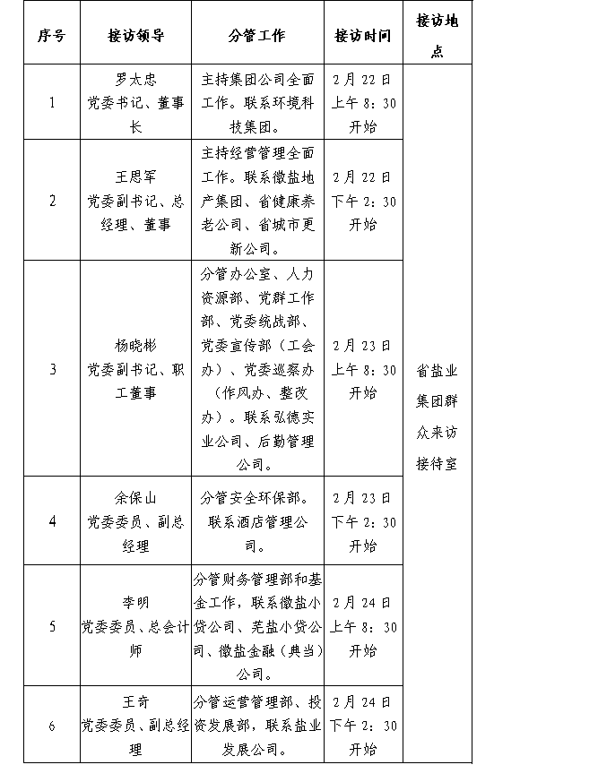 根據(jù)工作安排,現(xiàn)就省鹽業(yè)集團領導班子成員2月份接待省鹽業(yè)系統(tǒng)職工群眾來訪安排公示如下: