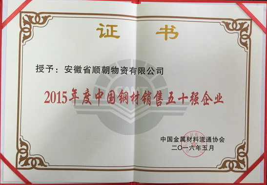 安徽順朝公司蟬聯(lián)“中國(guó)鋼材銷售五十強(qiáng)企業(yè)”稱號(hào)