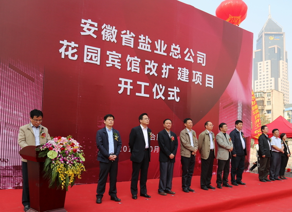 2014年10月18日上午,安徽省花園賓館改擴(kuò)建項(xiàng)目在花園賓館舉行隆重的開工奠基儀式,參加儀式的嘉賓有:中共廬陽(yáng)區(qū)委書記吳勁、副書記張家祥,廬陽(yáng)區(qū)副區(qū)長(zhǎng)李仲生、中建八局四公司董事長(zhǎng)周可璋及相關(guān)協(xié)作單位、省鹽業(yè)總公司總經(jīng)理詹先豪,副總經(jīng)理王良貴、顏?zhàn)谌A、楊曉彬,省公司本部機(jī)關(guān)處室及直屬公司主要負(fù)責(zé)人。