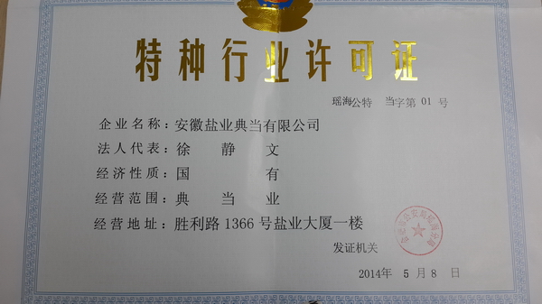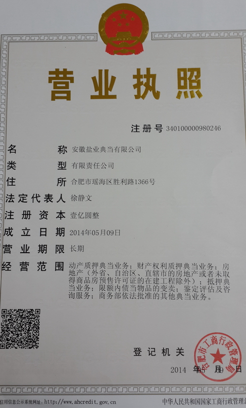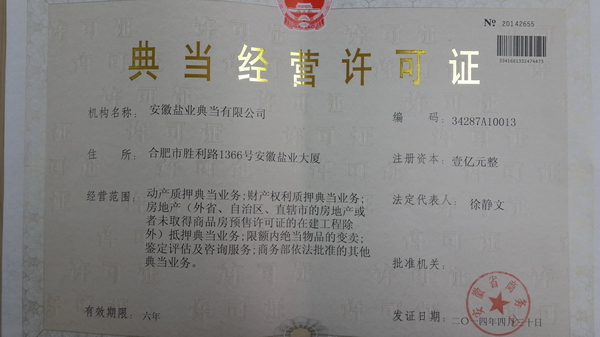 4月30日,安鹽典當(dāng)一次性通過合肥市商務(wù)局對(duì)營業(yè)網(wǎng)點(diǎn)的現(xiàn)場驗(yàn)收,并獲得市局頒發(fā)的《典當(dāng)經(jīng)營許可證》。隨后,合肥市局瑤海分局對(duì)營業(yè)網(wǎng)點(diǎn)的安保、監(jiān)控、消防等設(shè)施進(jìn)行了驗(yàn)收,即于5月8日頒發(fā)的《特種行業(yè)許可證》。5月9日,在合肥市工商局成功進(jìn)行工商登記注冊,并領(lǐng)取了典當(dāng)經(jīng)營《營業(yè)執(zhí)照》。