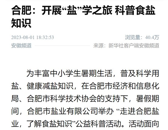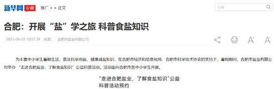 2023年7月,合肥鹽業(yè)自1950年成立以來首次對(duì)外開放,面向全市中小學(xué)生,開展“鹽”學(xué)之旅,食鹽科普游活動(dòng),活動(dòng)內(nèi)容包括參觀60年歷史的鐵路專用線、省市食鹽儲(chǔ)備倉庫,食鹽健康科普講座,7月份接待來自國內(nèi)外7所中小學(xué)校170名學(xué)生和家長(zhǎng),8月份已預(yù)約8場(chǎng)食鹽科普游。